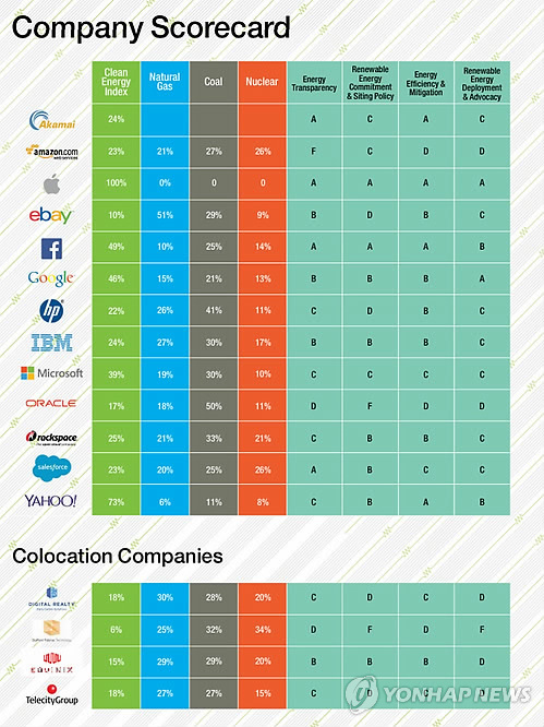 (샌프란시스코=연합뉴스) 임화섭 특파원 = 환경단체 그린피스가 주요 인터넷 기업들의 '환경 성적표'를 발표했다.