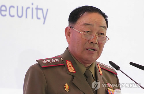 | △ 북한 현영철 인민무력부장 불경죄로 숙청 (서울=연합뉴스) 북한 현영철 인민무력부장이 불경죄로 숙청됐다고 13일 국정원이 밝혔다. 사진은 2015년 4월 16일 러시아 모스크바 래디슨 로얄 호텔에서 러시아 국방부가 주관한 제4차 국제안보회의에서 현영철 북한 인민무력부장이 연설하고 있는 모습. << 연합뉴스DB >> photo@yna.co.kr |