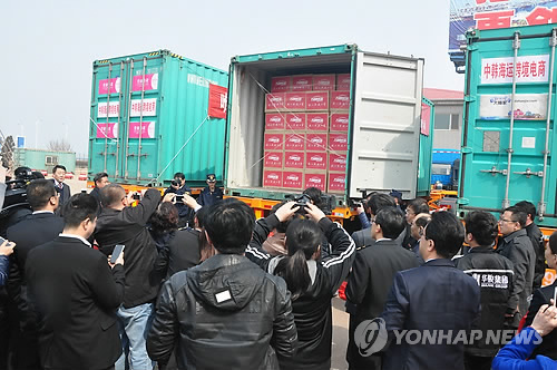 | △ 지난 3월 20일 칭다오 지모시 세관에 중국 소비자들이 한국 인터넷쇼핑몰에 주문한 물품들이 페리선을 통해 처음으로 들어왔다.(연합뉴스 자료사진) |