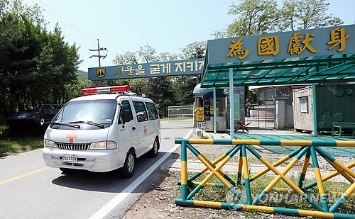 | △ 총기사고 부대서 나오는 구급차 (서울=연합뉴스) 신준희 기자 = 13일 총기 사고가 발생한 서울 내곡동 예비군훈련장에서 군 앰뷸런스가 나오고 있다. |