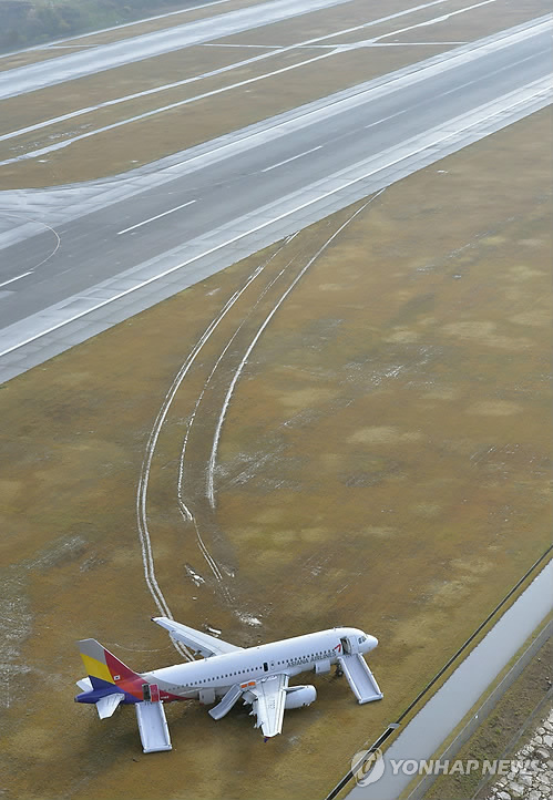그리고 약 180m를 지나 동체 뒷부분과 바퀴가 지면에 부딪혔으며 이후 활주로 시작부분부터 약 1천100m를 활주한 뒤 반시계방향으로 180도 돌면서 녹지대에 멈췄다.