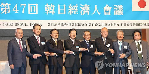 | △ 제47회 한일경제인회의 개최 (서울=연합뉴스) 홍해인 기자 = 13일 오후 서울 소공동 롯데호텔 크리스털 볼룸에서 열린 한일국교정상화 50주년 기념 제47회 한일경제인회의에서 양국 대표자들이 기념촬영을 하고 있다. 왼쪽부터 김인호 한국무역협회장, 허창수 전국경제인연합회장, 문재도 산업통상자원부 차관, 한국 단장 김윤 한일경제협회 회장, 일본 단장 사사키 미키오 일한경제협회 회장, 벳쇼 코로 주한일본대사, 사카키바라 사다유키 일본경제단체연합회장, 소마 히로히사 주한 일본경제공사. 2015.5.13 hihong@yna.co.kr |