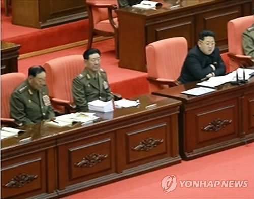 | △ '불경죄 처형' 북한 현영철, 김정은 옆에서 졸았나 (서울=연합뉴스) 김정은 북한 국방위원회 제1위원장이 지난달 30일 '불경죄'로 숙청한 현영철 전 인민무력부장(좌측 첫 번째)이 같은 달 24∼25일 김 제1위원장이 주재한 조선인민군 제5차 훈련일꾼대회에서 조는 듯한 모습이 포착돼 눈길을 끈다. 사진은 노동신문이 지난달 26일 보도한 것으로 김 제1위원장이 회의를 진행 중인 가운데 현 전 부장이 눈을 감고 몸을 앞으로 기울이고 조는 듯이 앉아 있어 꼿꼿한 자세로 정면을 응시하는 황병서 군 총정치국장과 대조된다. |
