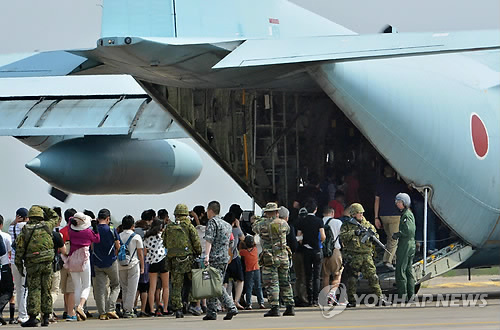 | △ (교도=연합뉴스.자료사진) 일본 자위대가 지난 2월 태국 중부 우타파오 해군 항공기지에서 해외 자국민 대피 훈련을 실시하는 모습. |