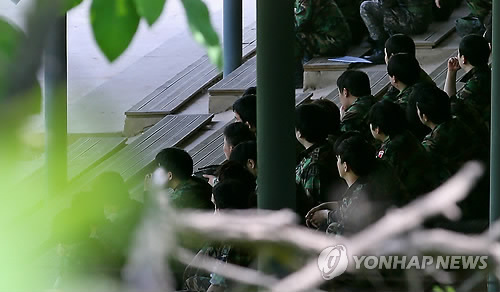 | △ '지금은 예비군 훈련 중' (서울=연합뉴스) 한종찬 기자 = 13일 오전 예비군 사격훈련중 총기 사망사고가 발생한 예비군 훈련장 인근에서 예비군들이 훈련을 받고 있다. 2015.5.13 saba@yna.co.kr |
