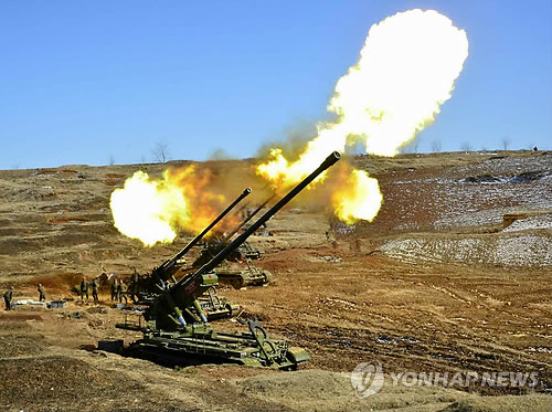 | △ 지난 2013년 3월 노동신문이 보도한 북한 김정은 국방위원회 제1위원장 참관하에 실시된 연평도·백령도 타격 포 사격훈련 장면. (연합뉴스 자료사진) |