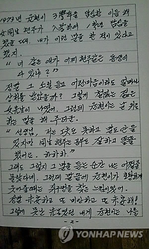 (서울=연합뉴스) 설승은 기자 = "1973년에 3학년이던 윤현이 담임이었는데 이듬해 1학년으로 입학한 여동생 현주의 담임을 맡았었지. 그때 '너 같은 애한테 어떻게 현주 같은 동생이 있느냐'고 했던 말이 상처가 됐을 거 같아 아직도 기억하고 있단다."