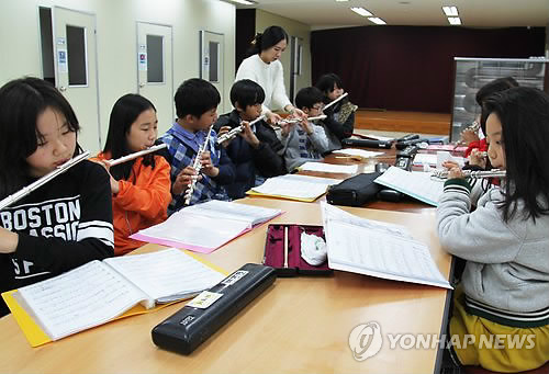 | △ 방과후교실에서 플루트 연주를 배우고 있는 충북 옥천 증약초등학교 학생들. |