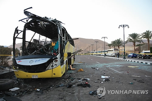 | △ 이집트 자살폭탄 테러의 참혹한 현장 (샤름 엘셰이크<이집트>=연합뉴스) 김준억 특파원 = 이집트 시나이반도 타바 국경검문소 앞에서 벌어진 자살폭탄 테러로 한국인 관광객들이 타고 있던 버스가 완파됐다. 2014.2.18 << 국제뉴스부 기사 참조 >> justdust@yna.co.kr |