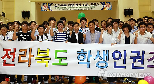 (전주=연합뉴스) 최영수 = 대법원이 14일 "두발과 복장의 자유, 체벌금지 등을 규정한 전라북도의 학생인권조례 효력이 유효하다"고 판결하자 전북지역에서는 "학생 인권의 소중함을 법적으로 인정받았다"는 환영 일색의 반응을 보였다.