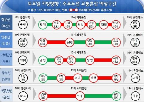 도로공사는 토요일 서울 출발 기준으로 대전까지 2시간20분, 강릉 2시간40분, 부산 5시간, 광주 4시간, 목포 4시간20분이 최대 소요시간이 될 것으로 전망했다.
