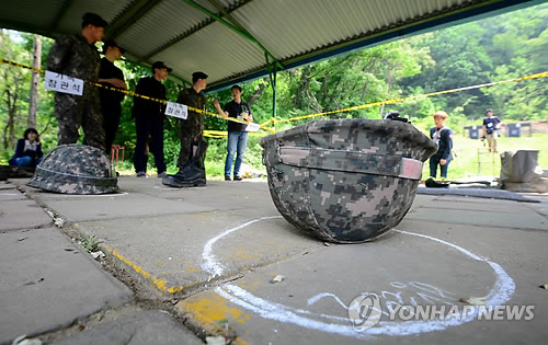 | △ 총기난사 예비군사격장 현장 (서울=연합뉴스) 임헌정 기자 = 예비군 총기 난사 사건 발생 다음 날인 14일 오후 서울 내곡동 예비군훈련장 내 사고현장인 예비군사격장에 방탄모가 놓여져있다. |