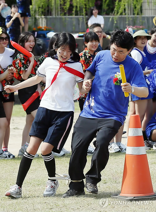 | △ 선생님과 호흡 척척 (인천=연합뉴스) 윤태현 기자 = 스승의 날을 하루 앞둔 14일 오후 인천시 연수구 연수여자고등학교에서 열린 '스승의 날 기념 체육대회' 2인3각 경기에서 한 교사가 제자와 함께 전력 질주하고 있다. |