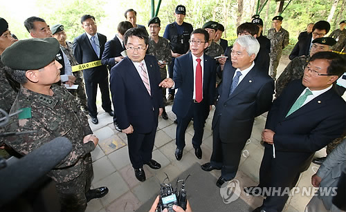 | △ 총기난사 훈련장 찾은 국회 국방위 (서울=연합뉴스) 임헌정 기자 = 국회 국방위원회 소속 윤후덕(오른쪽부터), 백군기, 홍철호 의원이 14일 서울 내곡동 예비군훈련장 사격장에서 김용현 수도방위사령관(왼쪽부터), 백승주 국방부 차관으로부터 전날 발생한 총기난사 사건과 관련한 설명을 듣고 있다. |
