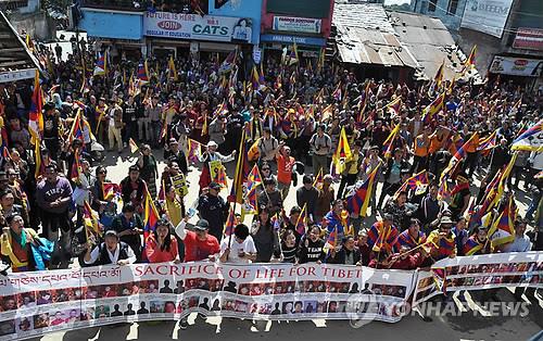 | △ 인도에 망명한 티베트인들이 지난 3월10일 인도 북부지역에서 '반중국 항쟁일' 56주년을 맞아 시위를 벌이고 있다.(EPA=연합뉴스DB) |