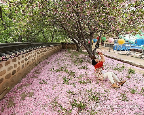 | △ (청송=연합뉴스) 성연재 기자 = 진 꽃도 꽃이다. 주왕산 대전사 겹벚꽃이 아름답게 떨어진 곳에서 여행자가 사진을 찍고 있다.2015.5.15 polpori@yna.co.kr |
