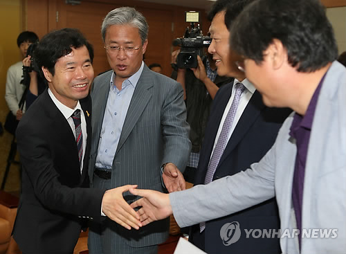 | △ 김승환 전북도교육감과 전북 국회의원들 간담 (전주=연합뉴스) 최영수 기자 = 김승환 전북도교육감(왼쪽)이 15일 오후 어린이집 누리과정 예산 문제를 해결하기 위해 찾아온 유성엽 의원을 비롯한 전북지역 국회의원들과 악수하고 있다. 2015.5.15 kan@yna.co.kr |