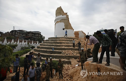 | △ 중국에서 규모 5.0 이상의 중·대형 지진이 연간 20차례 이상 발생하는 것으로 나타났다. 최근 네팔에서 발생한 강진으로 중국인이 사망하기도 했다. 사진은 유네스코 세계문화유산인 카트만두 빔센(다라하라) 타워가 파괴돼 잔해를 철거하는 장면. |