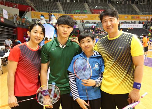| △ 16일 경기도 고양시 고양체육관에서 열린 '2015 전국 다문화가족 배드민턴대회'에 선수로 참가한 송영우(사진 우측) 씨 가족. 부인 오시로 크리스티나(사진 좌측)와 자녀 송우성(좌측 두번째)과 송기성. |