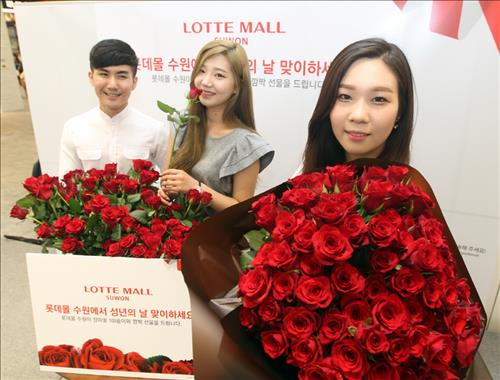| △ 모델들이 롯데몰 수원점의 성년의 날 행사를 홍보하고 있다. 롯데몰 수원점은 오는 18일 방문객을 대상으로 목걸이, 향수, 장미꽃 등을 추첨을 통해 증정한다. |