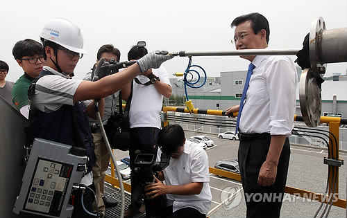 | △ (청주=연합뉴스) 김형우 기자 = 청주 오창화학산업단지의 악취가 여전하다. 충북도는 매년 악취 발생원인 규명에 나서지만 마땅한 해결책이 없어 골치를 앓고 있다. 사진은 지난해 7월 오창산단의 발암가능물질인 디클로로메탄 배출농도를 측정하는 국립환경과학원 관계자. <<연합뉴스DB>> |