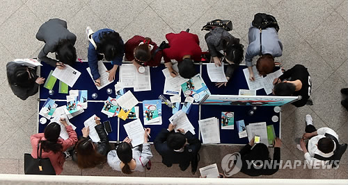 | △ 청년 채용박람회를 찾은 구직자들이 기업체에 제출할 이력서를 작성하고 있다. (연합뉴스 자료사진) |