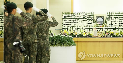| △ "영원히 기억할게"…예비군 사망자 영결식 (성남=연합뉴스) 이우성 기자 = 서울 내곡동 예비군훈련장에서 발생한 총기난사 사건으로 숨진 예비군 영결식이 18일 오전 성남 국군수도병원 영결식장에서 육군 제52사단장으로 엄수됐다. 2015.5.18 gaonnuri@yna.co.kr |