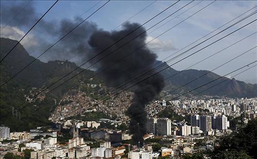 | △ 리우 시내 빈민가에서 또다시 경찰과 범죄조직 간에 총격전이 벌어졌다. 총격전이 일어난 빈민가에서 화재로 연기가 나고 있다. 브라질 일간지 폴랴 지 상파울루 인터넷판에 실린 사진. |