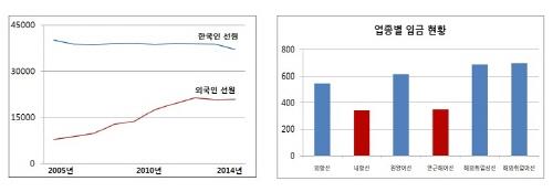 한국인 선원은 2005년 4만176명에서 10년 사이 7.6%(3천51명) 감소한 반면 외국인 선원은 7천960명에서 162%(1만2천934명) 증가했다.