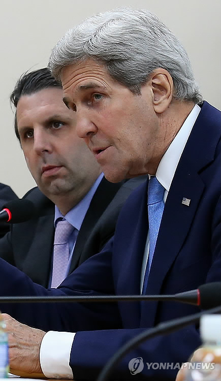 | △ 케리 美 국무부 장관 모두발언 (서울=연합뉴스) 전수영 기자 = 존 케리 미국 국무부 장관이 18일 오전 서울 외교부 청사에서 열린 윤병세 외교부 장관과의 한·미 외교장관 회담에서 모두발언을 하고 있다. |