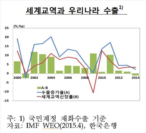 금융위기 전까지만 해도 연평균 13.0%(국민계정 기준)였던 한국의 수출 증가율은 이 여파로 2013년 4.5%에 이어 2014년에는 2.3%로 떨어졌다.