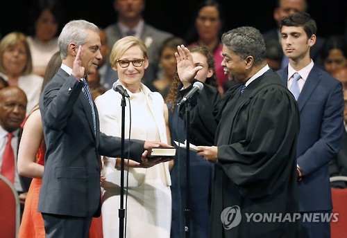 | △ 람 이매뉴얼 미국 시카고 시장이 2기 취임 선서를 하고 있다. (AP=연합뉴스) |