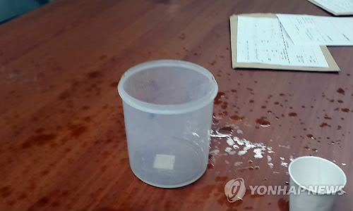 | △ 서씨는 지난해 12월 5일 수원시 영통구 수원지검 404호 형사조정실에서 자신이 명예훼손으로 고소한 조교 강모씨와 형사조정 절차를 밟던 중에 황산 543㎖를 강씨의 얼굴 등에 뿌린 혐의로 구속기소됐다. 사진은 사건 현장에 황산이 담겨져있던 컵 (연합뉴스 자료사진) |
