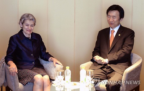 보코바 총장은 이날 인천 송도의 오크우드 호텔에서 열린 윤병세 외교부장관과의 면담에서 "여러 경로를 통해 (일본의 세계유산 등재추진과 관련한) 한국 측의 우려를 잘 알고 있고, 한국 측의 제안으로 한일 양자협의가 개최되는 것을 높이 평가한다"면서 이같이 말했다.