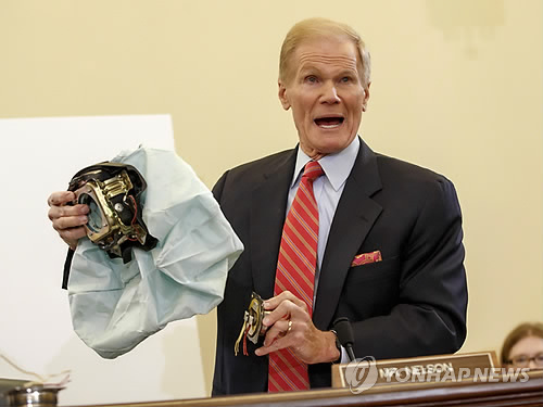 | △ 빌 넬슨(민주·플로리다) 의원이 워싱턴에서 열린 청문회에서 다카타사의 에어백을 든 채 발언하고 있다.(AP=연합뉴스 자료사진) |