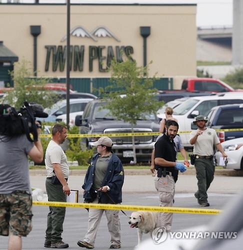 | △ 미국 경찰이 19일(현지시간) 미국 텍사스 주 웨이코의 트윈 픽스 식당과 주차장 주변을 통제하고 탐지견을 동원해 폭주족 조폭 조직원의 차량을 조사하고 있다. (AP=연합뉴스) |