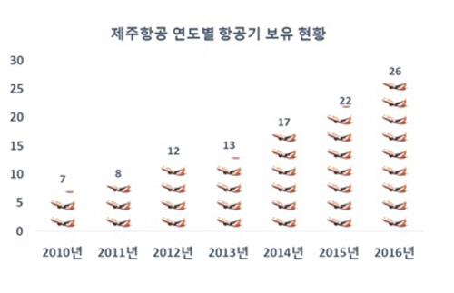 현재 진에어는 항공기 13대, 에어부산 14대, 이스타항공과 티웨이항공은 각각 10대를 보유하고 있다.