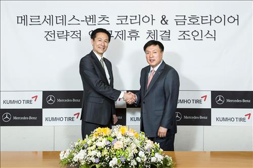 금호타이어[073240]는 전날 서울 중구의 메르세데스-벤츠 코리아 본사에서 전략적 업무제휴 체결 조인식을 갖고, 교체용 타이어 공급과 관련해 업무를 공조하기로 했다.