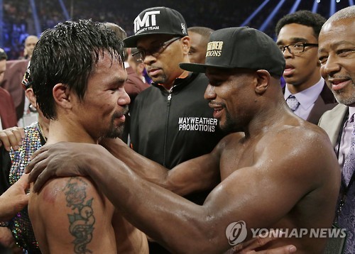(서울=연합뉴스) 안홍석 기자 = 플로이드 메이웨더 주니어(38·미국)와 매니 파키아오(37·필리핀)가 '세기의 졸전'으로 '축구의 신' 리오넬 메시(바르셀로나)보다 더 많은 돈을 벌어들인 것으로 나타났다.