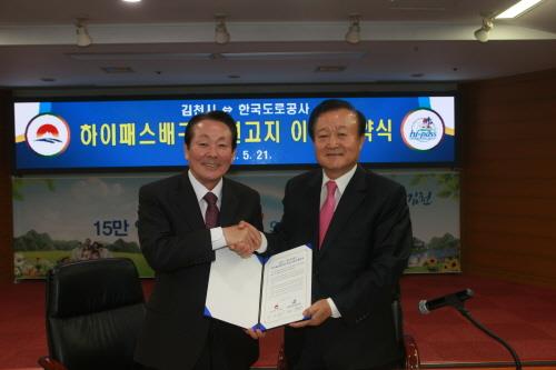 도로공사 김학송 사장과 박보생 김천시장은 21일 배구단 연고지 이전 협약서에 서명했다.