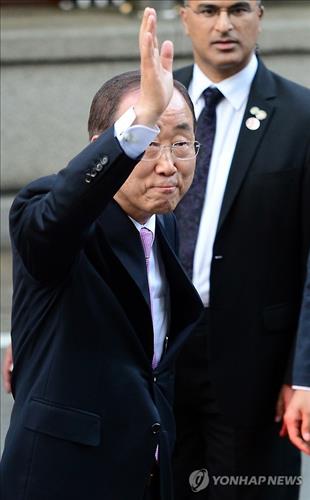 | △ (서울=연합뉴스) 전수영 기자 = 반기문 유엔 사무총장이 20일 오후 서울 도렴동 외교부 청사에서 열린 유엔 창설 70주년 기념 특별 행사를 마친뒤 청사를 나서며 인사하고 있다. 2015.5.20 |