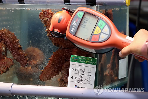 | △ 휴대용 방사능 측정기를 이용해 일본산 수산물의 방사능 오염 여부를 검사하는 모습. (연합뉴스 자료사진) |