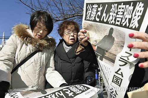 | △ 지난 2월1일 새벽 이슬람 수니파 원리주의 무장단체 이슬람국가(IS)가 일본인 인질 고토 겐지(後藤健二·47) 씨를 참수했다고 주장하는 영상을 공개한 뒤 도쿄 긴자에서 시민들이 신문사 호외를 받아 읽는 모습(교도.연합뉴스.자료사진) |