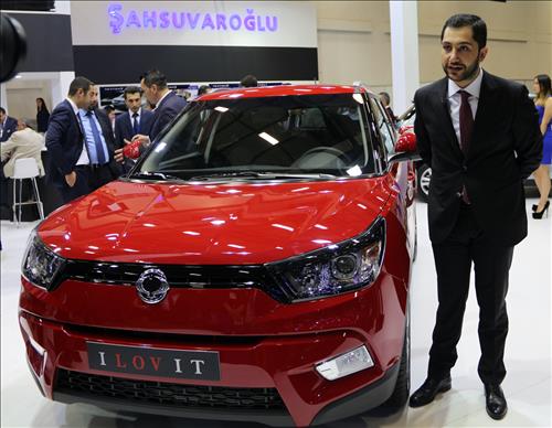 | △ 쌍용자동차 터키대리점 유누스 사슈바로글루(Yunus Sahsuvaroglu) 부사장이 이스탄불모터쇼에서 티볼리와 함께 포즈를 취하고 있다. |