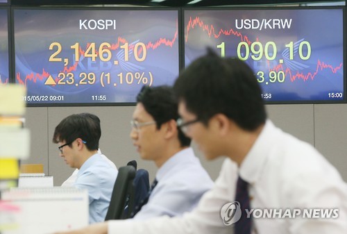 | △ 코스피 큰 폭으로 올라 (서울=연합뉴스) 박동주 기자 = 코스피가 22일 외국인과 기관의 쌍끌이 매수에 큰 폭으로 올랐다. 코스피 지수는 전날보다 23.29포인트(1.10%) 오른 2,146.10으로 장을 마쳤다. 이날 오후 서울 중구 외환은행 본점 딜링룸에서 직원들이 업무를 보고 있다. |