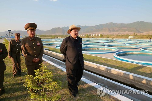 | △ 북한, 김정은 제810군부대 양어장 방문 (서울=연합뉴스) 김정은 북한 국방위원회 제1위원장이 인민군 제810군부대 산하 석막대서양연어종어장과 낙산바다연어양어사업소를 시찰했다고 노동신문이 23일 보도했다. 김 제1위원장은 지난 19일 자라 양식공장 시찰때 내내 관계자들을 질책하며 크게 화를 냈던 것과 달리 이번에는 거듭 큰 만족감을 표시하며 관계자들을 치하하고 아낌없는 지원을 약속했다. 2015.5.23 nkphoto@yna.co.kr |