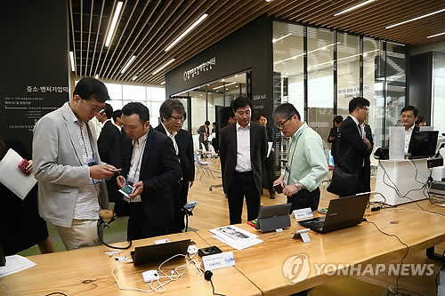 | △ 지난달 30일 경기 창조경제혁신세터에서 열린 핀테크 지원센터 제1차 Demo-day에서 핀테크 스타트업 및 예비 창업자들이 참석자들에게 핀테크 기술을 시연하고 있다. (금융위원회 제공) |