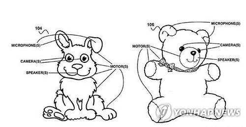 | △ 고개 돌려 대답하는 토끼·곰인형…구글 특허출원 (샌프란시스코=연합뉴스) 임화섭 특파원 = 세계 최대 인터넷 기업 구글이 사람을 보면 고개를 돌려 얘기를 듣고 대답하는 인형에 대한 특허를 출원했다. 23일(현지시간) 미국 특허상표청(USPTO) 출원공개시스템에 따르면 구글은 귀에 마이크로폰이, 눈에 카메라가, 입에 스피커가, 목에 모터가 각각 달린 인형에 대한 특허를 2012년 2월 출원했다. 사진은 21일 공개된 특허 출원 서류에 포함된 그림. solatido@yna.co.kr |