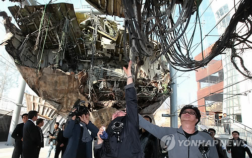 | △ 천안함 만져보는 천안함 46용사 가족 (평택=연합뉴스) 신영근 기자 = 천안함 피격 사건 5주년인 26일 오후 경기도 평택 해군 제2함대사령부 피격 천안함을 천안함 46용사 가족들이 안타까운 마음으로 만져보고 있다. 2015.3.26 drops@yna.co.kr http://blog.yonhapnews.co.kr/geenang |