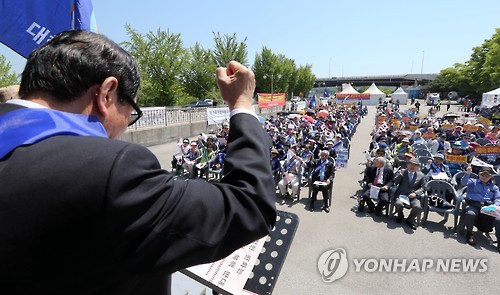 (파주=연합뉴스) 최재훈 기자 = 보수단체 회원 400여명은 24일 남북 비무장지대(DMZ)를 걸어서 건너오는 행사를 하는 위민크로스DMZ(WCD)가 북한 찬양단체라고 비난하며 맞불 집회를 열었다.